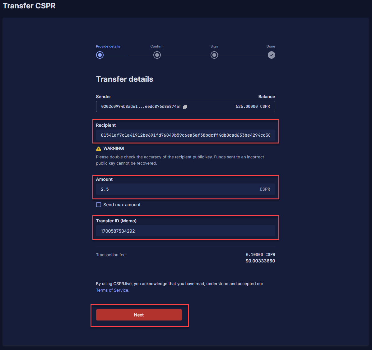 **Stap 2:** Vul de public key in waar je $CSPR naar toe wilt sturen onder '**Recipient**', de hoeveelheid $CSPR onder '**Amount**' en vul een specifieke Transfer ID in als dat nodig is onder '**Transfer ID (Memo)**'. Dit laatste is soms nodig als je $CSPR naar een exchange stuurt. Als dit niet nodig is kun je '**0**' invullen. Klik hierna op '**Next**'.
