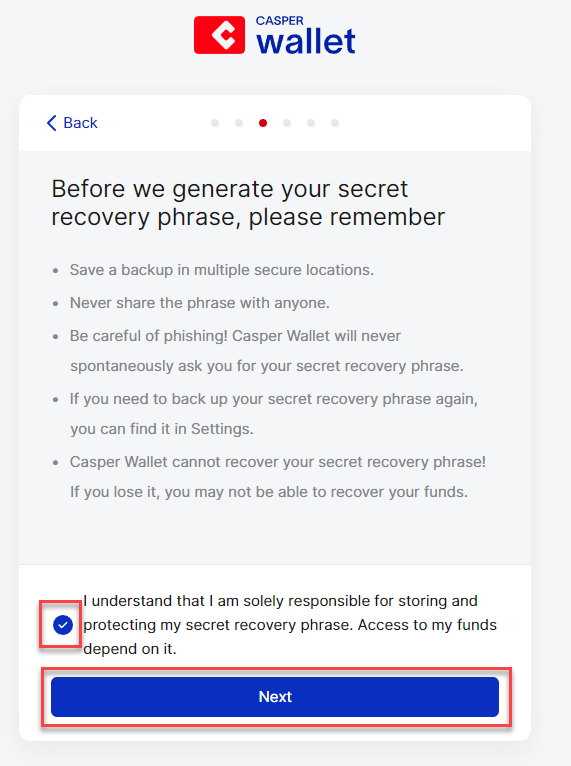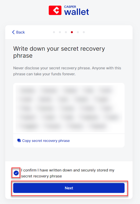 **Stap 8:** Sla je secret recovery phrase veilig op, plaats een vinkje en klik op '**Next**'.