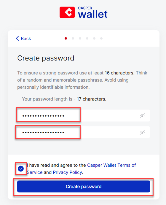 **Stap 5:** Bedenkt een veilig wachtwoord, vul deze 2x in, plaats een vinkje, en klik op '**Create password**'.