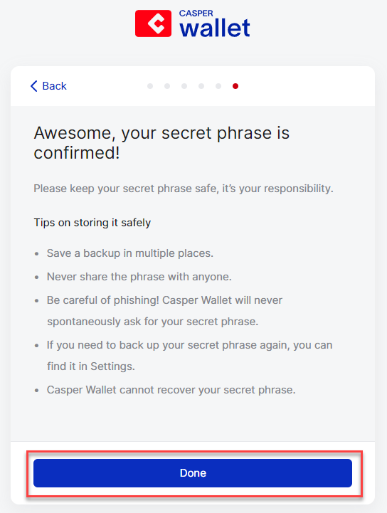 **Stap 5:** Je hebt succesvol je $CSPR verstuurd. Klik op '**Done**'.