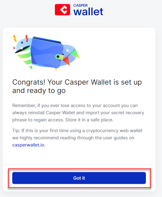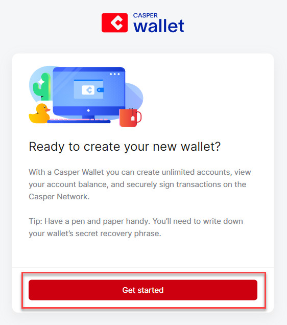 **Stap 4:** Na het toevoegen van de Casper Wallet extension zal een nieuwe browser tab openen voor de setup; klik op '**Get started**'.