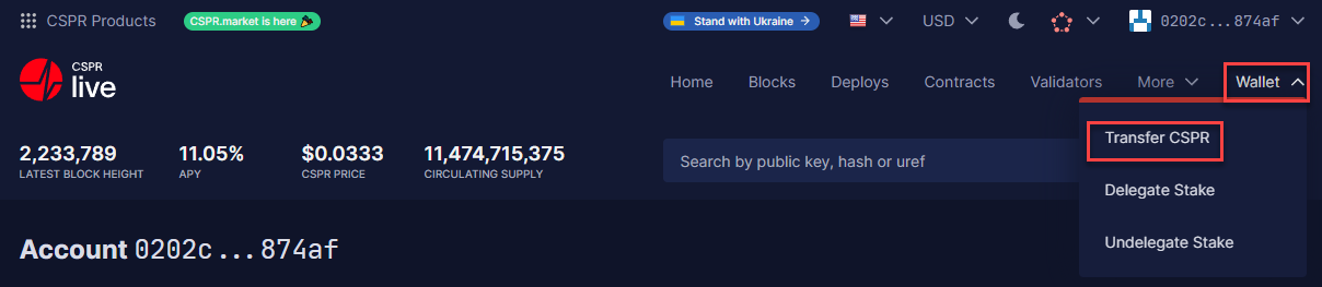 **Stap 1:** Beweeg je muis over '**Wallet**' aan de rechterbovenkant van je scherm en selecteer '**Transfer CSPR**'.