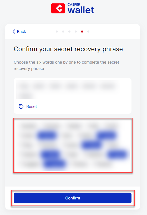 **Stap 9:** Vul de missende woorden uit je secret recovery phrase in op de juiste plek en klik op '**Confirm**'.