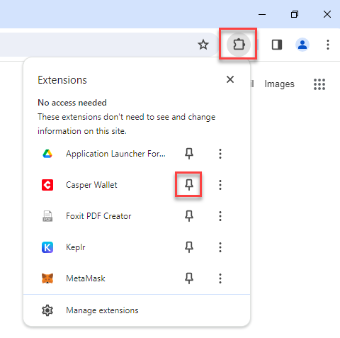 **Stap 12 (aanrader):** Ga naar de extensies (rechterbovenkant van je scherm) en klik op het pinnetje naast de Casper Wallet. Op deze manier heb je altijd makkelijk toegang tot de Casper Wallet extensie.
