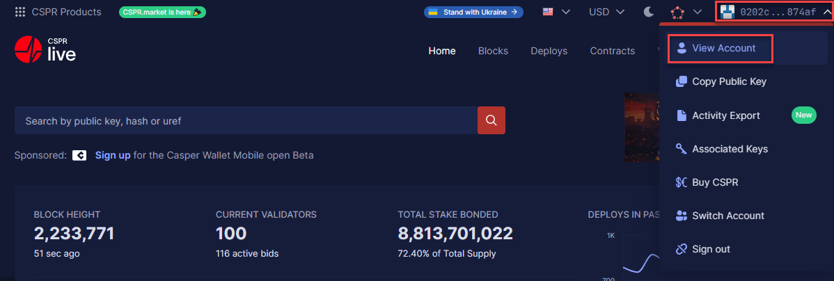 **Stap 1:** Beweeg je muis over je public key aan de rechterbovenkant van je scherm en selecteer '**View Account**'.